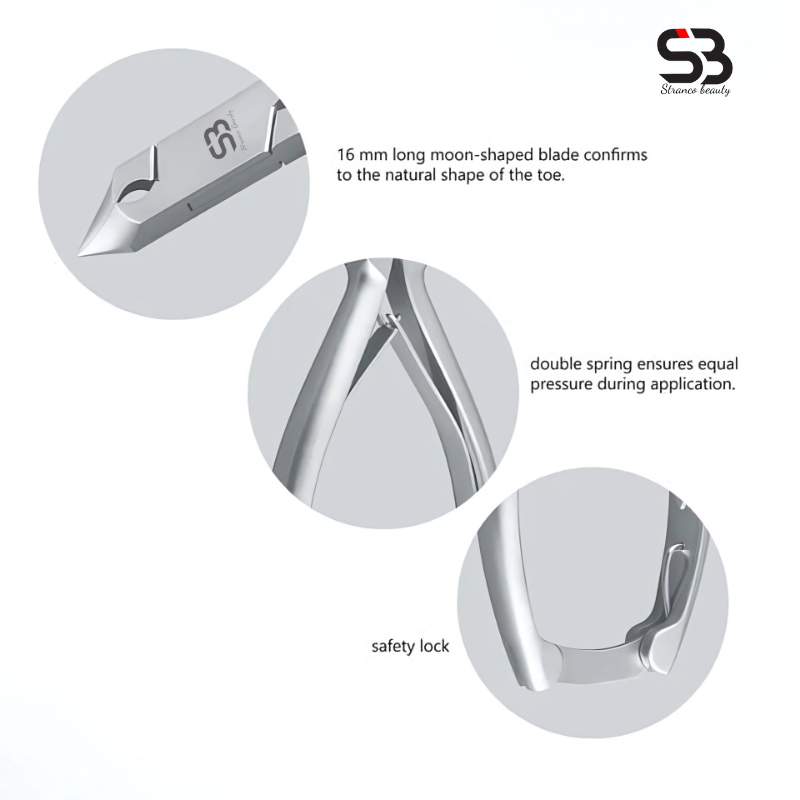 With a cutting surface of 16mm and a size of 14cm, this cutter is perfectly designed for precision trimming, making it ideal for professional or personal nail care. The half head shape allows for optimal control and accessibility, ensuring clean cuts even in tight spaces. The double spring with lock feature ensures secure handling and easy storage when not in use.